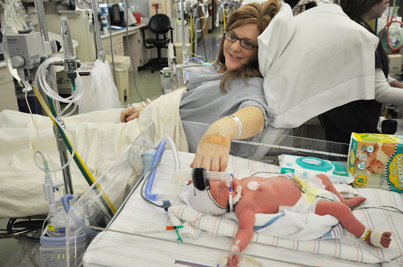 On Thursday, 2 days after delivery I was able to hold Graham for the first time. At this point he had been put on a ventilator. The C-pap machine was making him agitated and it was becoming harder and harder for him to breathe. The ventilator was breathing for him so he didn't have to work as hard. Here I am holding him for the first time.